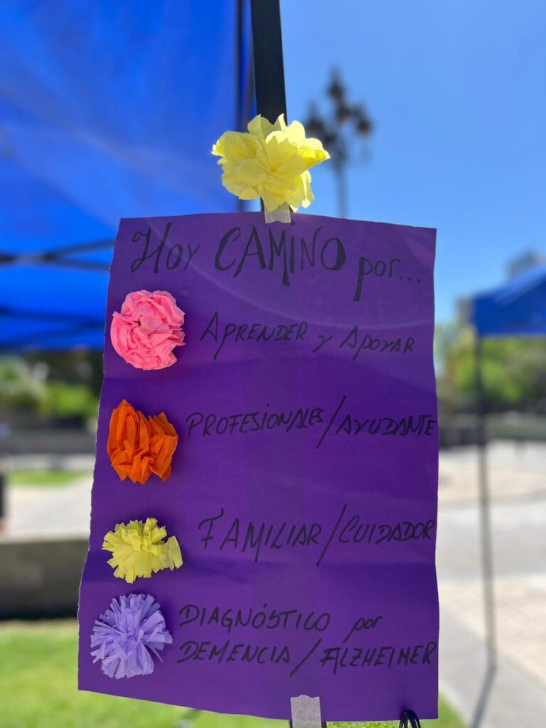 Los organizadores armaron flores de papel de distintos colores para que los asistentes pudieran llevarlas según su rol o función dentro del universo de la lucha contra el Alzheimer. Rosa, para los que iban a aprender y acompañar; naranja, para profesionales y ayudantes, amarillo para familiares o cuidadores y, muy significativas fueron las flores color violeta, que representaron a los pacientes con diagnóstico de demencia o Alzheimer.